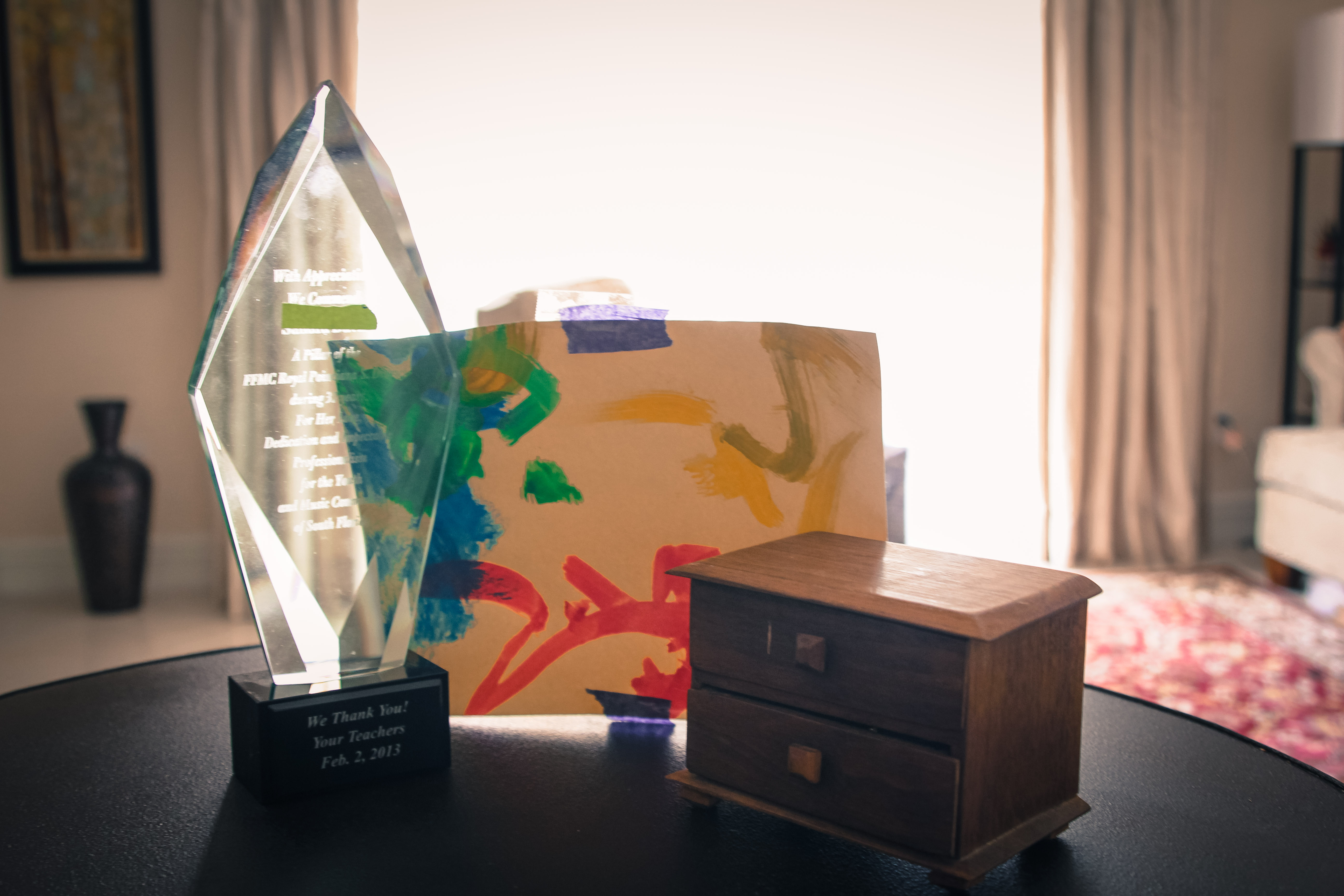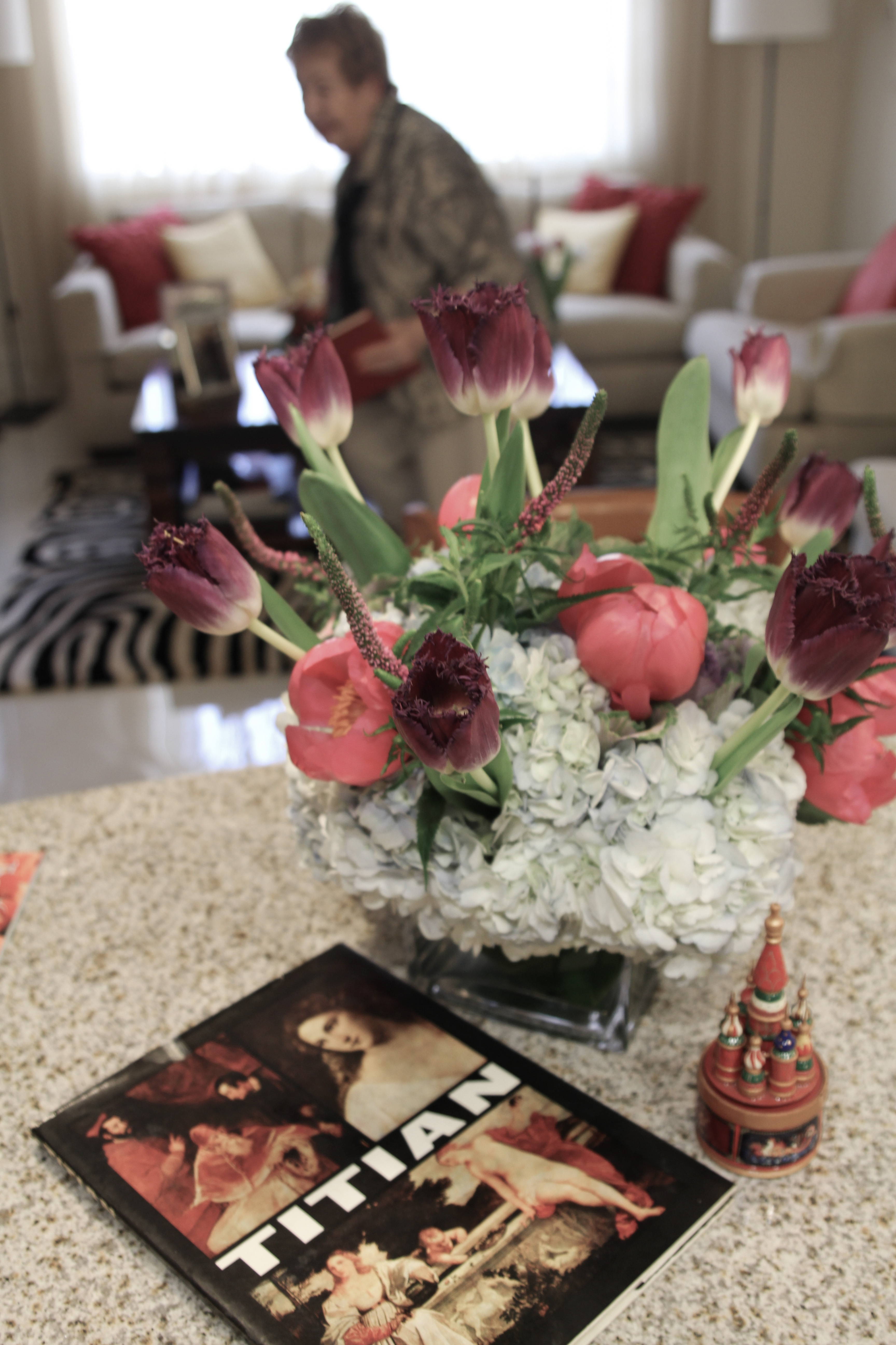 The music box on the right was from Russia and the tulips were for Mother’s day – from her Grandchild.